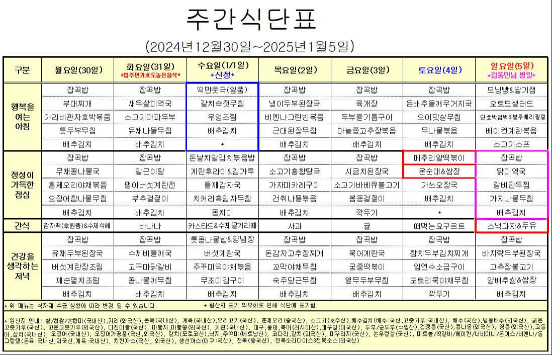 1¿ù 1°ÁÖ ½Ä´ÜÇ¥ ÀÔ´Ï´Ù.