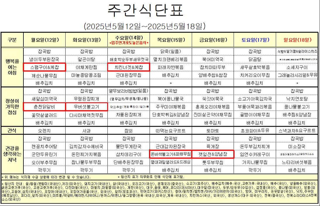 5¿ù 2°ÁÖ ½Ä´ÜÇ¥ ÀÔ´Ï´Ù.