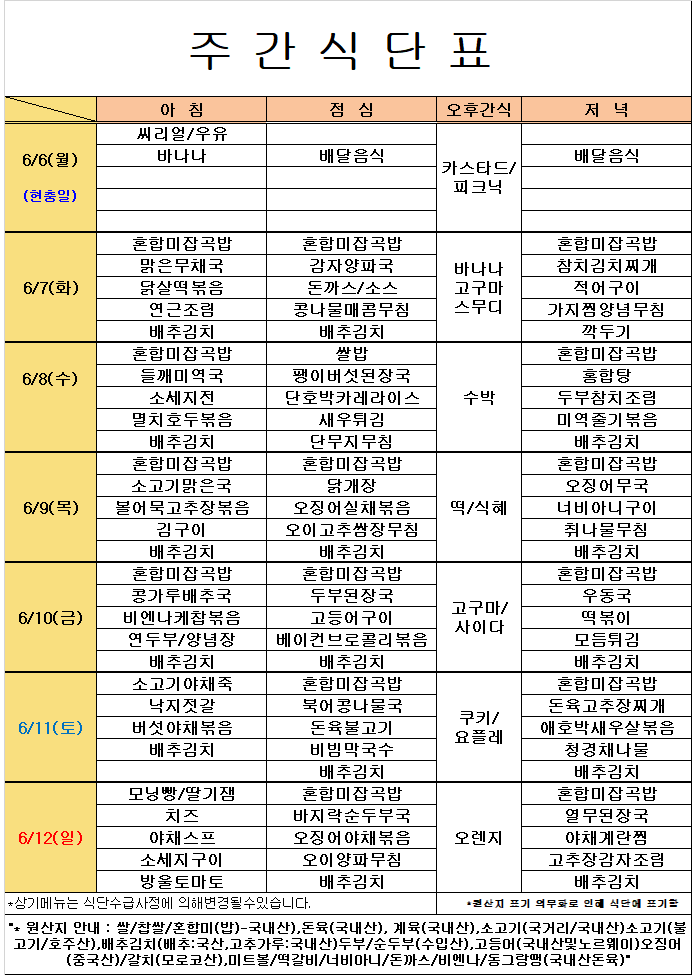 6¿ù2°ÁÖ ½Ä´ÜÇ¥ÀÔ´Ï´Ù.