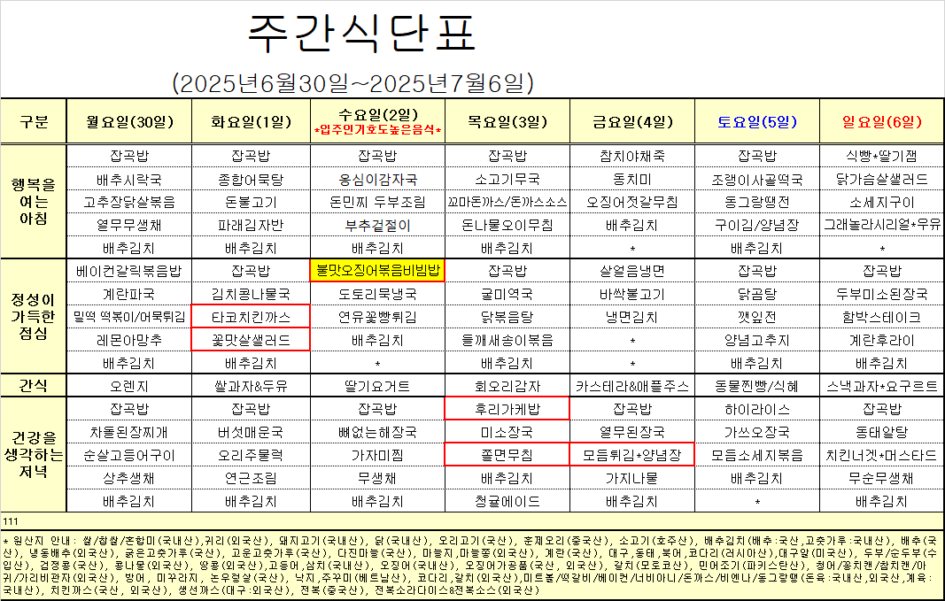 7¿ù 1°ÁÖ ½Ä´ÜÇ¥ ÀÔ´Ï´Ù.