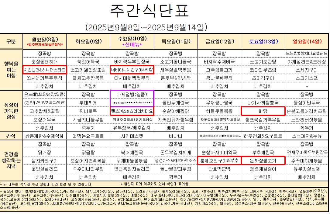 9¿ù 2°ÁÖ ½Ä´ÜÇ¥ÀÔ´Ï´Ù.