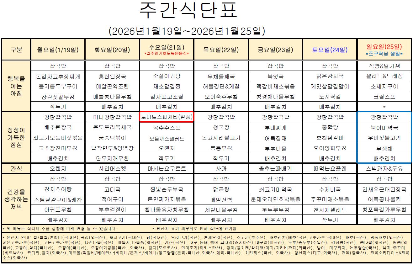 ÇູÇѵ¿Çà 26³â 1¿ù 4°ÁÖ ½Ä´ÜÇ¥ ÀÔ´Ï´Ù.