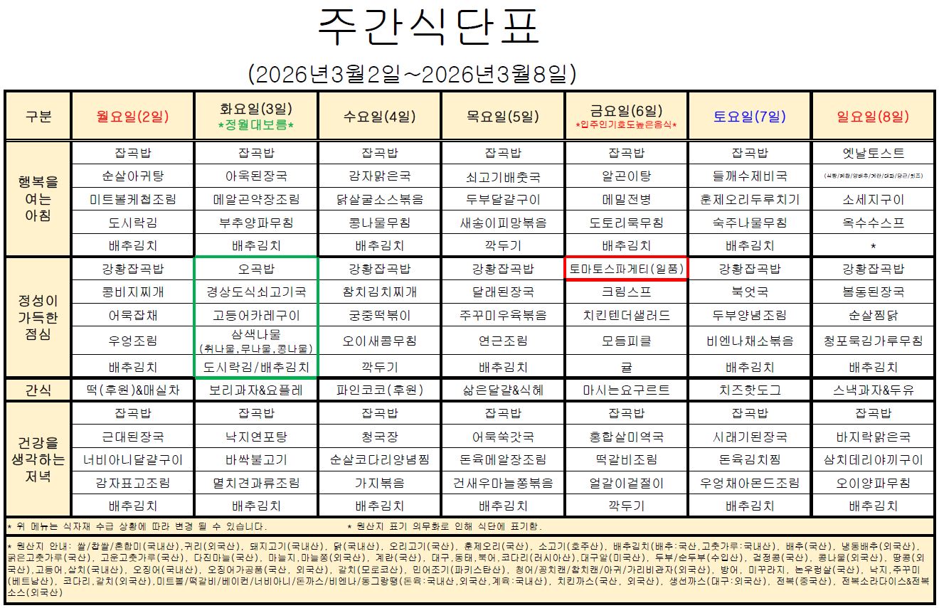 ÇູÇѵ¿Çà 26³â 3¿ù 1°ÁÖ ½Ä´ÜÇ¥ ÀÔ´Ï´Ù.