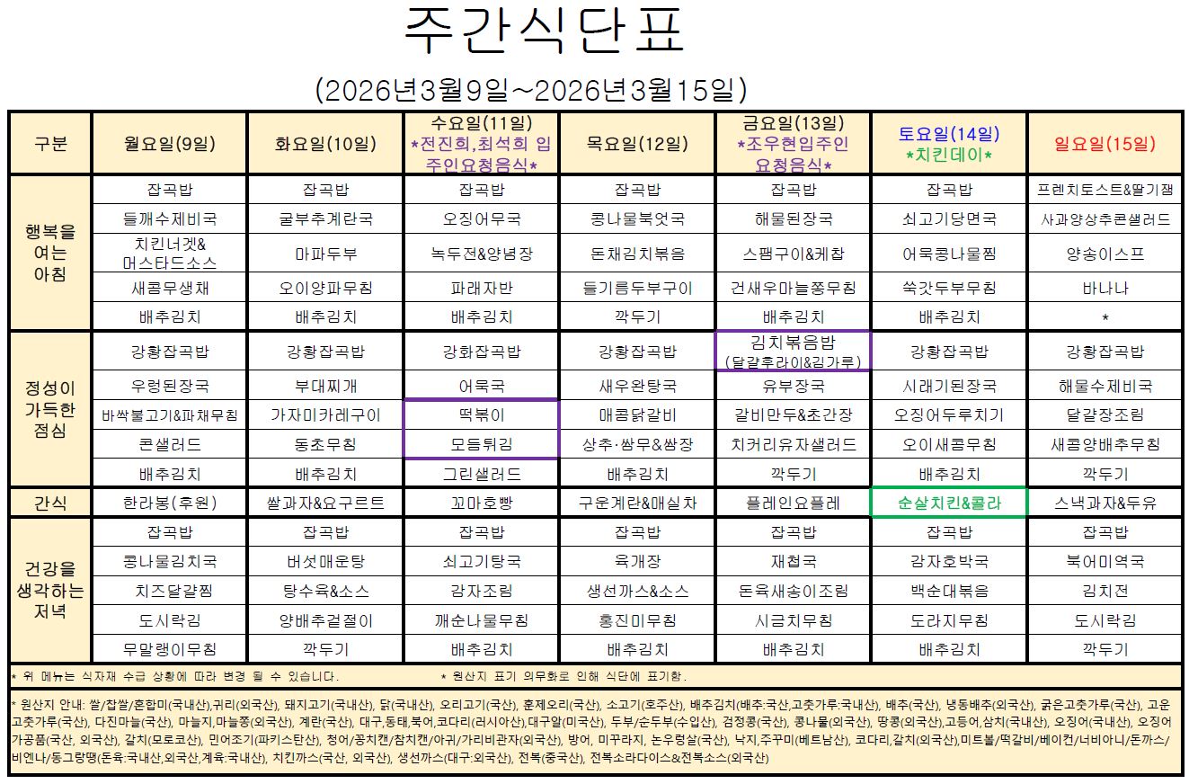 ÇູÇѵ¿Çà 26³â 3¿ù 2°ÁÖ ½Ä´ÜÇ¥ ÀÔ´Ï´Ù.