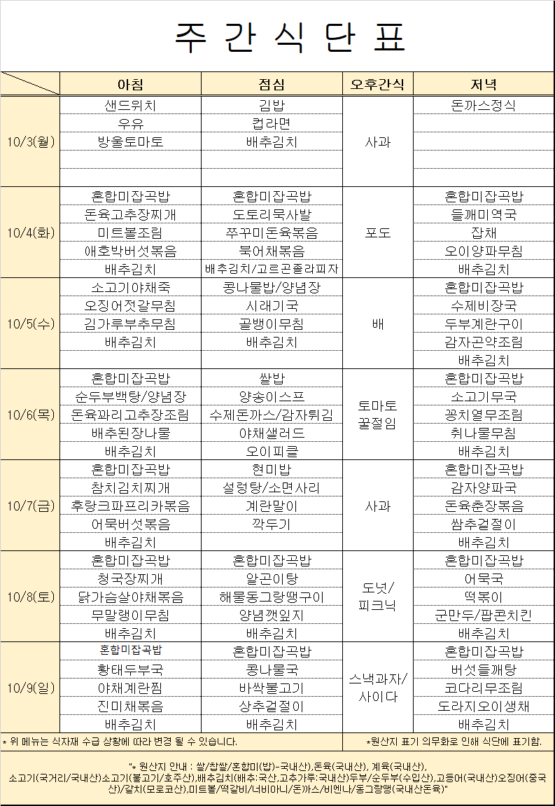 10¿ù1°ÁÖ ½Ä´ÜÇ¥ÀÔ´Ï´Ù.