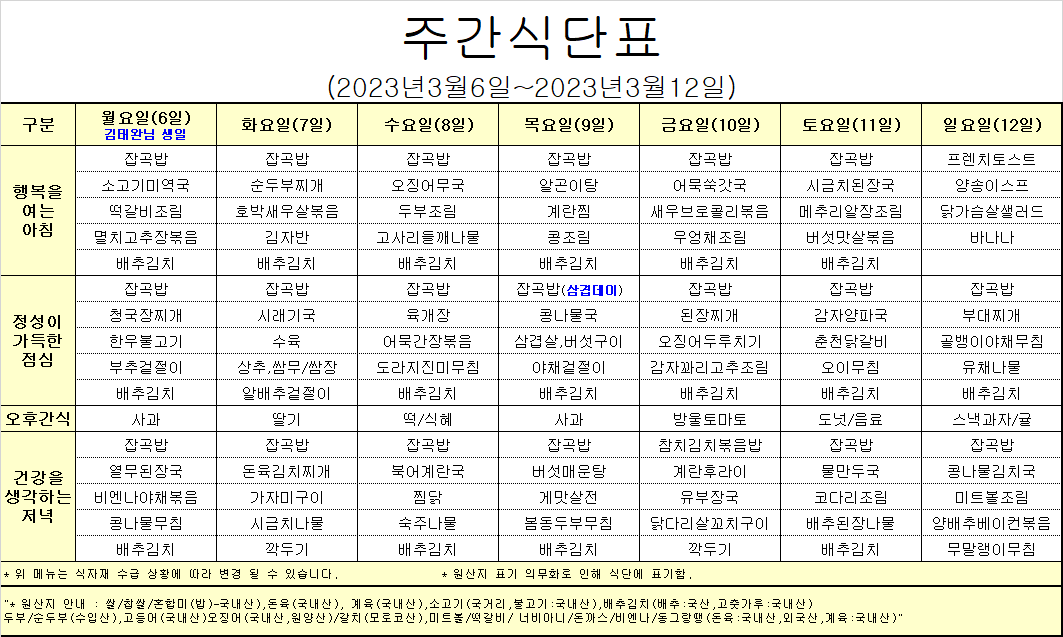 3¿ù2°ÁÖ ½Ä´ÜÇ¥ÀÔ´Ï´Ù.