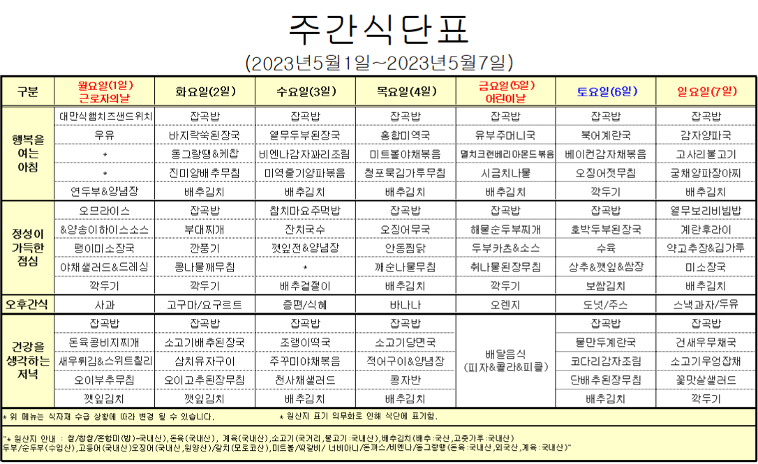 5¿ù 1°ÁÖ ½Ä´ÜÇ¥ ÀÔ´Ï´Ù.