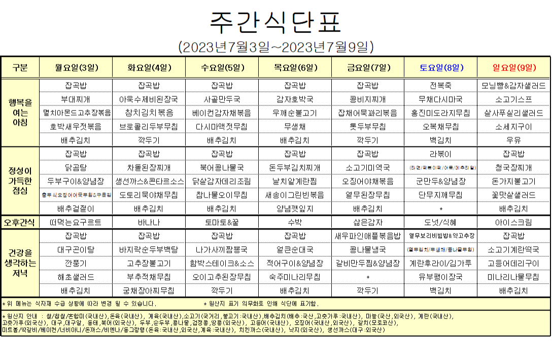 7¿ù 1°ÁÖ ½Ä´ÜÇ¥ ÀÔ´Ï´Ù.