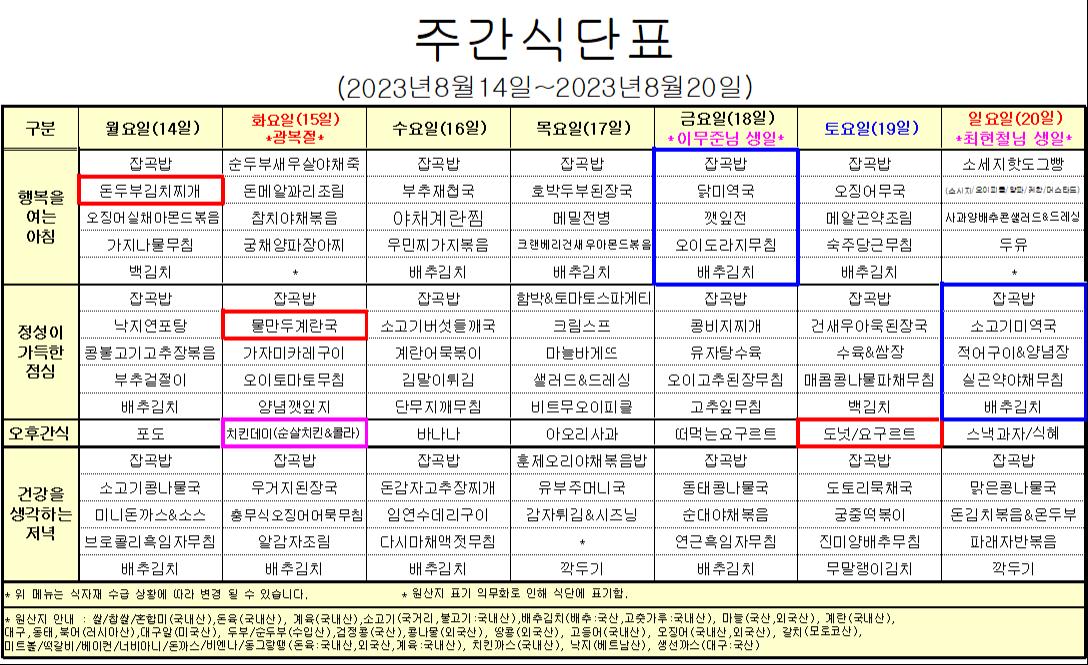 8¿ù 3°ÁÖ ½Ä´ÜÇ¥ÀÔ´Ï´Ù.