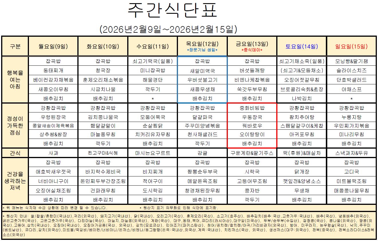 ÇູÇѵ¿Çà 26³â 2¿ù 2°ÁÖ ½Ä´ÜÇ¥ ÀÔ´Ï´Ù.