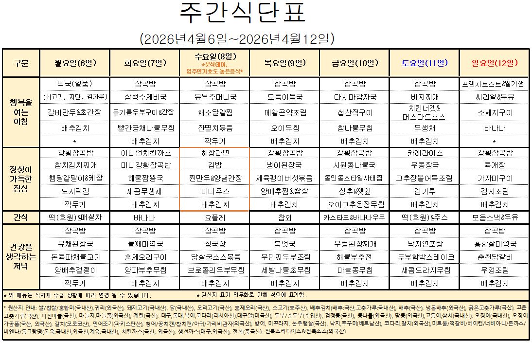 26³â 4¿ù 2°ÁÖ ½Ä´ÜÇ¥ ÀÔ´Ï´Ù.